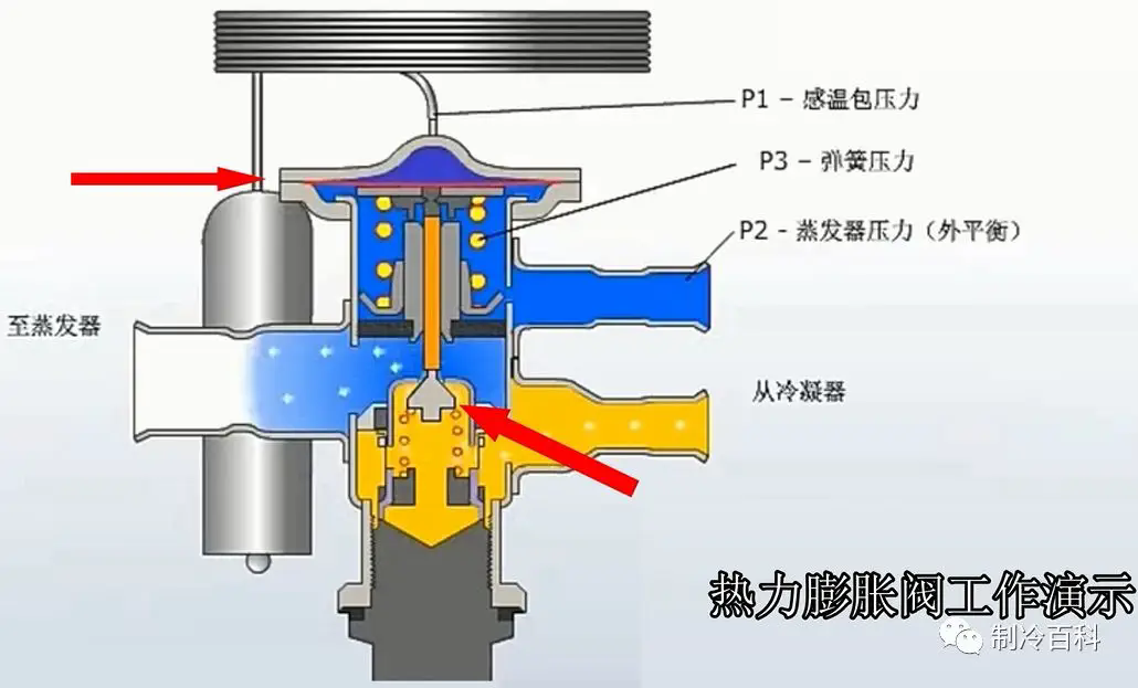 熱力膨脹閥冰堵塞一般發生在膨脹閥的節流孔處,其故障特征是:制冷系統開始運行時制冷正常,但過了一段時間,蒸發器開始出現融霜現象。待融霜過程結束以后,蒸發器恢復制冷狀態,過一段時間后再次出現融霜現象。遇到熱力膨脹閥冰堵塞問題的處理方法是:對于熱力膨脹閥輕微冰堵, 可用熱毛巾敷在熱力膨脹閥冰堵處,即可化開冰堵,恢復制冷系統運行;如果冰堵程度比較嚴重,不能恢復制冷系統的正常運行,可將干燥過濾器兩端的截止閥關閉,從制冷系統上拆下干燥過濾器,更換干燥過濾器中的干燥劑后,先打開干燥過濾器進液口的截止閥,松開出液口的截止閥進口納子,待有氣體跑出后擰緊再打開干燥過濾器出液口的截止閥,即可消除故障現象,恢復制冷系統正常運行。2、冷庫系統臟堵特征與處理方法冷庫系統臟堵的特征是制冷系統的壓縮機運行正常,但蒸發器不結霜,高壓排氣壓力比正常值偏低,低壓回氣壓力比正常值也偏低甚至為負值。制冷系統發生臟堵后,制冷劑不能循環,引起高低壓力繼電器低壓保護動作,壓縮機停機。再次手動開機,故障現象依然,就是典型的臟堵故障了。熱力膨脹閥經常出現臟堵,其特點是:當膨脹閥的進口處出現結霜(或閥蓋也結霜),進液管的溫度比常溫低,甚至結露。壓縮機的吸氣壓力低于庫溫下的相對應的正常壓力,冷庫內溫度下降緩慢或不下降,這說明熱量膨脹閥存在臟堵現象。遇到熱力膨脹閥出現臟堵問題的處理方法是:將制冷系統的出液閥至蒸發器的截止閥關閉。拆開膨脹閥的進液口,取出濾網用煤油清洗后重新裝回,更換干燥過濾器中的干燥劑后,先打開干燥過濾器進液口的截止閥,松開熱力膨脹閥出液口的截止閥進口納子,待有氣體跑出后擰緊再打開熱力膨脹閥出液口的截止閥,即可消除故障現象,回復制冷系統正常運行。3、冷庫系統油堵特征與處理方法冷庫制冷系統油堵是指熱力膨脹閥的閥孔被凝固的潤滑油堵塞而阻礙制冷劑流動的現象。一般發生在低溫冷庫的制冷系統,或選用凝固點偏高,以及劣質冷凍油所致,因為劣質冷凍油凝固點偏高,可能造成冷凍潤滑油在與制冷劑混合后,流經熱力膨脹閥閥孔時,因溫度驟降而使部分潤滑油從制冷劑中析出并凍成厚糨糊狀,造成熱力膨脹閥閥孔被堵塞,遇到制冷系統油堵問題,通常需要更換冷凍油。[[文章來源:制冷百科,版權歸原作者所有,如有版權問題請聯系刪除]]
