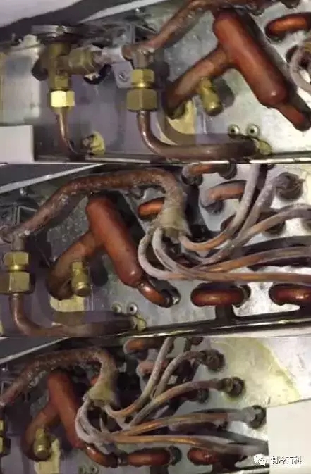 冷凝器回液溫度和壓力正?;蚵云停晒?jié)流閥處開始逐步向蒸發(fā)器方向結(jié)霜。