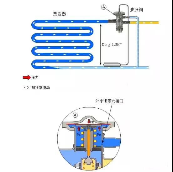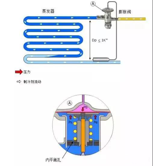 內(nèi)平衡式的平衡壓力在蒸發(fā)器入口處取,用于制冷劑在蒸發(fā)器里的壓力損失較小的系統(tǒng)。