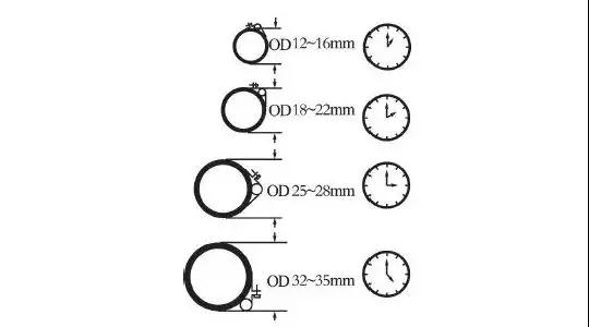 對于 12 ~ 16 mm的管徑,感溫包宜安裝在吸氣管的“1 點(diǎn)鐘”位置。