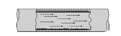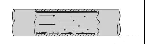 之所以這樣做,是因?yàn)槲鼩夤苤兄饕且颜舭l(fā)的制冷劑,但是也有少許制冷劑液體和油。下圖顯出制冷劑蒸氣和一些液珠流過較大管徑的吸氣管。由于管徑較大,制冷劑蒸氣的流速常常很低,制冷劑液珠和油沉積在管線底部。