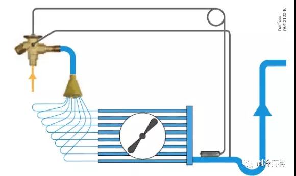 供液量不足的盤管內(nèi)制冷劑很快蒸發(fā),在出口產(chǎn)生較大過熱度,換熱面積沒有得到有效利用。供液量過多的盤管內(nèi)出口過熱度很小,甚至帶有未蒸發(fā)的液體,(本文來源:制冷百科公眾號)換熱面積不足, 同時,蒸發(fā)器出口總管由于制冷劑的混合或再次蒸發(fā),過熱度低于理論值,過熱度降低,對節(jié)流裝置產(chǎn)生的信號是供液量過多,節(jié)流裝置自行調(diào)節(jié),以減少供液量;供液量減少,質(zhì)量流量降低,分液效果更差,形成惡性循環(huán);最終導致蒸發(fā)器有效面積急劇減少,制冷量下降,整個制冷系統(tǒng)運行性能惡化......