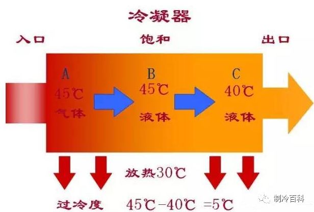 以R22冷媒為例,假設冷凝器內的壓力為1.64MPa,則飽和溫度為45℃。飽和狀態的A-B間為45℃,A-B間冷媒為氣液混合狀態(潛熱)。B-C間所有的氣體已經變為液體,狀態為全液體狀態,并且不斷向周圍散熱,使溫度繼續下降[本文來源:制冷百科公眾號],譬如降至40℃ 。這時冷凝器出口溫度比冷凝器內的溫度低5℃,這種狀態稱為過冷,我們稱這時流出的冷媒有5℃的過冷度(過冷度=45-40=5℃)。