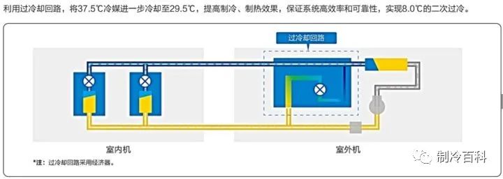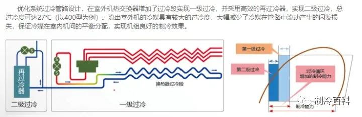 二次過冷技術不僅起到一定的節能效果,而且液態冷媒被二次過冷后冷媒輸送距離得到了大幅提升(未被二次過冷的液態冷媒也許走個30米的銅管就會變成氣液混合的狀態,這樣容易阻礙冷媒的輸送,但是被“二次過冷”后走個40米可能還是液態)。