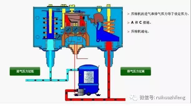 壓縮機高低壓保護:壓縮機常常需要保護,以防止冷凝壓力過高或者進氣壓力過低。實現的方法是使用兩個單壓開關或者一個雙壓開關。開關有多種 電氣接觸類型。這里看到的是一個簡單的類型。高壓和低壓開關組合在一個殼體內。