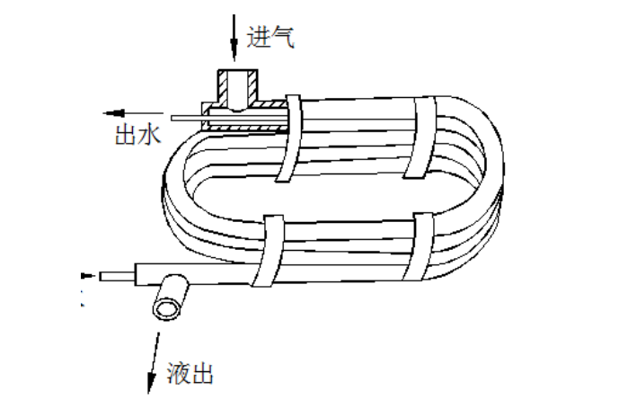 1—出液管;2—壓力表接頭;3—進(jìn)氣管;4—配水箱;5—安全閥接頭;6—均壓管;7—放空管;8—放油管3. 套管式冷凝器:它是由不同直徑的管子套在一起,并彎制成螺旋形或蛇形的一種水冷式冷凝器。如圖所示,制冷劑蒸氣在套管間冷凝,冷凝液從下面引出,冷卻水在直徑較小的管道內(nèi)自下而上流動(dòng),與制冷劑成逆流式,因此傳熱效果較好。套管式冷凝器